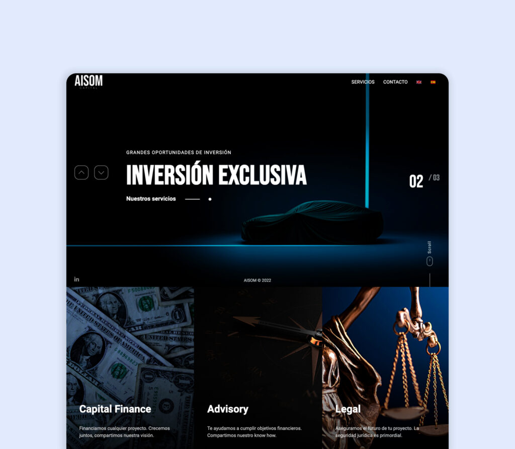 AISOM CAPITAL es un hub. de oportunidades de inversión que ha confiado en BorealMi para llevar a cabo el desarrollo de su web corporativa, en la que describen sus servicios, la configuración SEO de la misma, para mejorar el posicionamiento en buscadores y el diseño de su logotipo e imagen de marca.